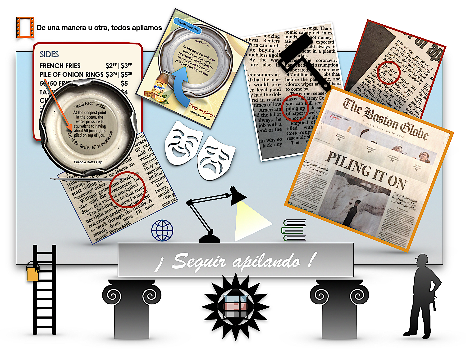 Las imágenes de arriba y de abajo, que representan la palabra pila (pile) y variantes, no tienen absolutamente algo que ver con la plataforma pile-it. Ninguna constituye respaldo, apoyo, relación o afiliación, declarada o implícita, con la plataforma pile-it o cualquiera de sus características. Las imágenes están aquí simplemente para mostrar la palabra pila (pile) con la que se ha encontrado el creador de la plataforma pile-it al leer diferentes materiales como periódicos, menús de restaurantes y debajo de tapas de botellas, por nombrar algunos. A continuación se proporciona un enlace de cada fuente respectiva.